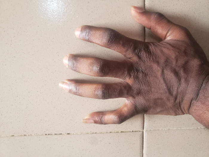 An overhead view displays the dorsal aspect of a human left hand with dark skin, resting flat against a tiled surface
