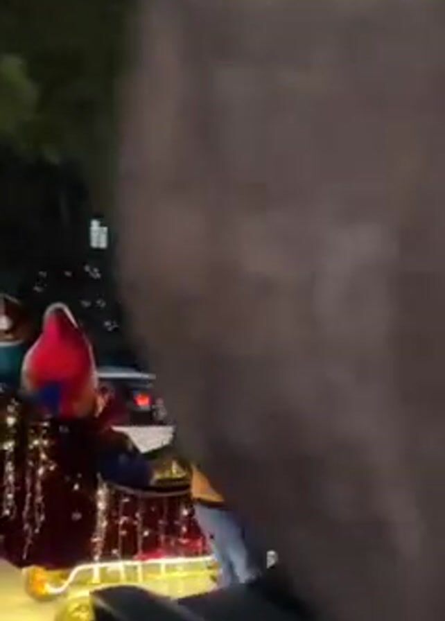 A video shows a vehicle decorated as Santa's sleigh moving along a street at night
