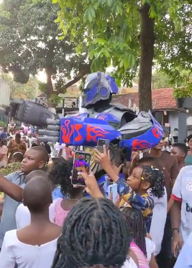 The video depicts a large, colorful Transformer-like robot figure surrounded by a crowd of people, mostly children, outdoors