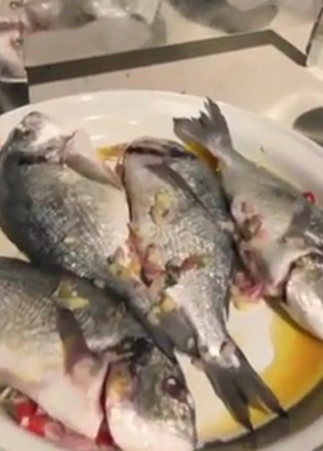 - "white serving dish filled with several whole fish marinating in a yellow liquid, possibly oil" by FM-K790o1, licensed under CC BY 4.0