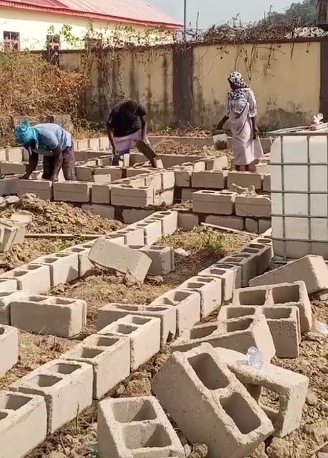 Three people are working on a construction site. One person, wearing a blue head covering and a blue shirt, is placing rectangular blocks on the ground. A second person, wearing shorts, is also placing blocks. A third person, wearing a light-colored robe and head covering, is pouring liquid from a small container onto the blocks. The blocks are arranged in rows, forming a foundation or border. A large white plastic container sits to the right of the scene. In the background, there's a building with a red roof and a wall topped with barbed wire. A solar-powered light post is also visible. The ground is dirt and some sparse vegetation is scattered around.