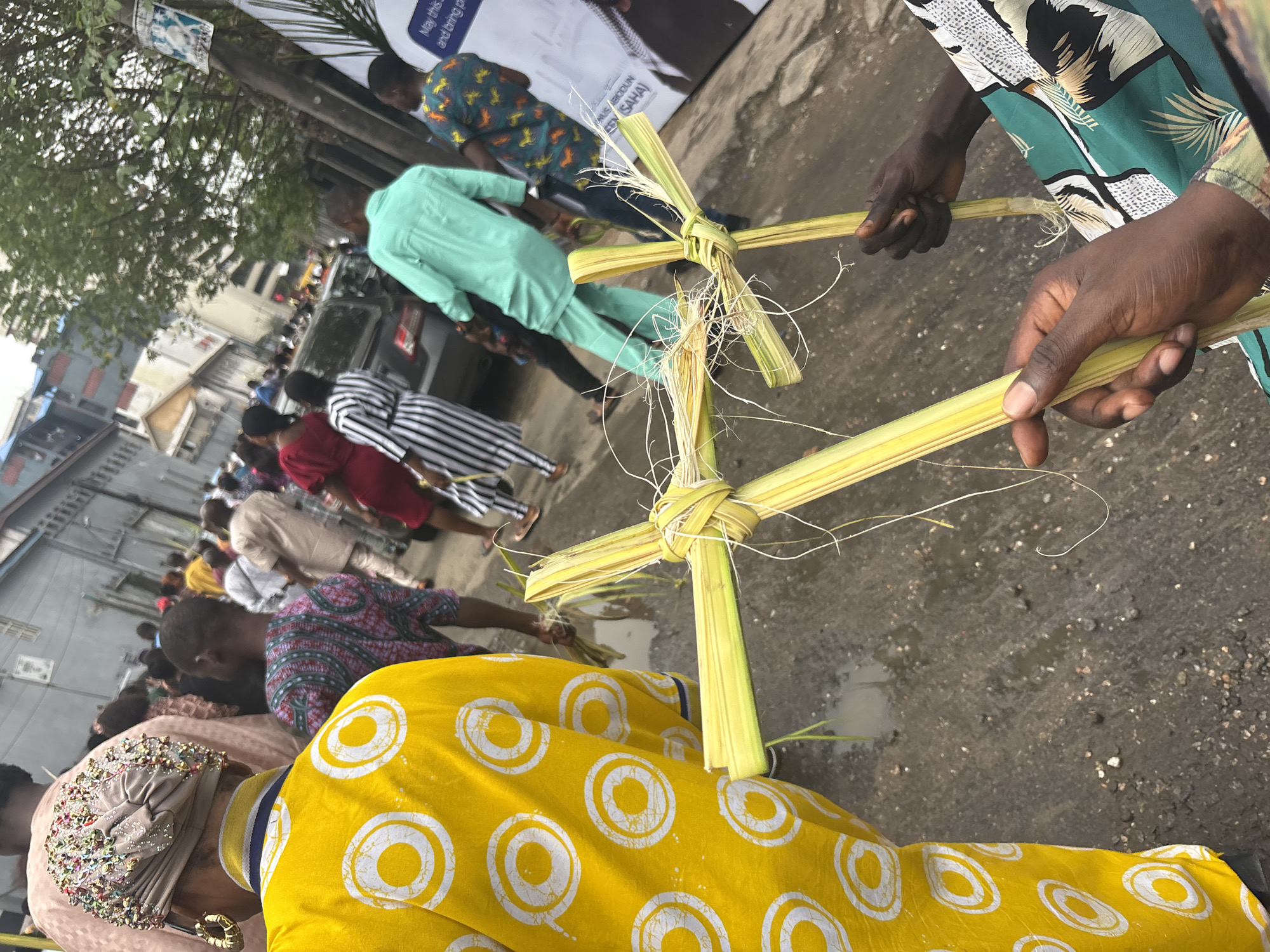 The image depicts a procession of people in Lagos, Nigeria, likely during a religious event, possibly Palm Sunday. The focus is on individuals holding palm fronds crafted into cross shapes. People are dressed in various colorful attires, with a woman in the foreground wearing a yellow and white patterned dress. The procession moves along a city street, partially wet and reflective, with buildings and vehicles visible in the background. A banner or poster is seen on the right. The atmosphere suggests a public celebration or religious observance.