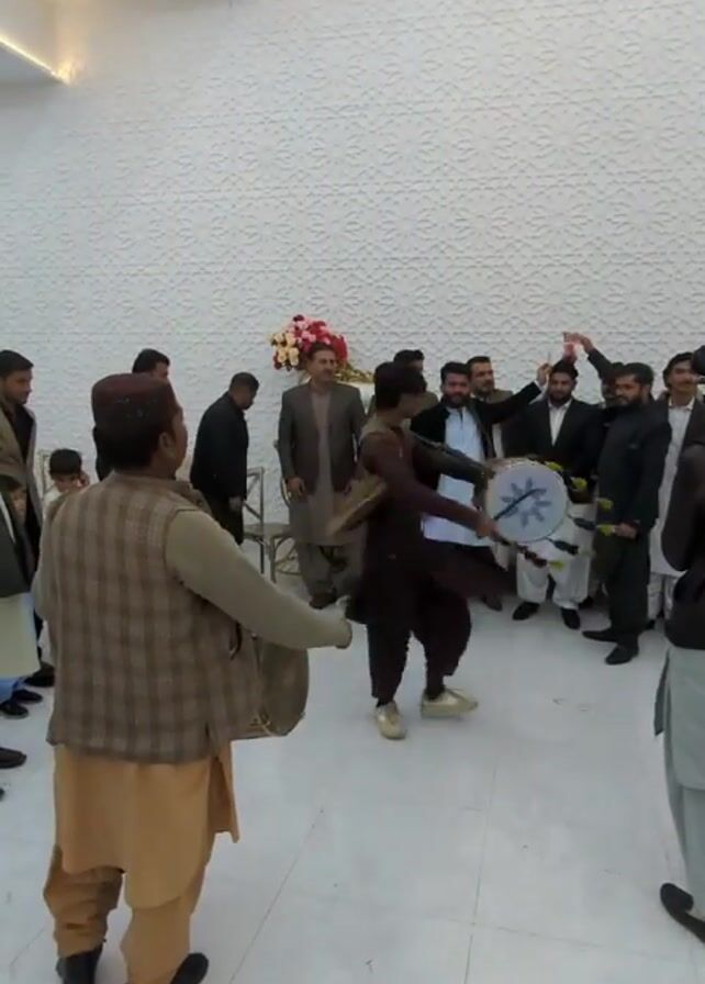 Several men and one child are gathered in a room with a white textured wall, light tile floor, and modern recessed lighting. Two men in traditional clothing are playing drums, while another man dances in the center of the group. Most of the other men are dressed in suits and observing the performance. Some are filming with their phones and cheering. There is a flower arrangement on a chair in the background.