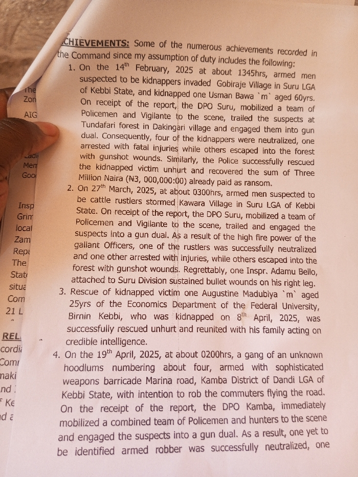 This is a printed document detailing achievements of the Command since the assumption of duty. The document describes four incidents involving the apprehension of criminals. The location of these incidents, however, is not explicitly mentioned. The document's content refers to locations such as Gobiraje Village, Suru LGA of Kebbi State, Dakingari village and Kwara Village, Suru LGA of Kebbi State. The document is printed on a white, textured paper, with an indented border. The text is in black ink and there are no images present. The font is Times New Roman. The first incident involves the apprehension of alleged kidnappers who had kidnapped Usman Bawa in Gobiraje Village, Suru LGA of Kebbi State, on February 14th, 2025, at around 1345hrs. Police apprehended four of the kidnappers after a gun duel in the Tundafari forest. One of the kidnappers was killed, while the other three were injured. The second incident describes the apprehension of cattle rustlers who stormed Kwara Village, Suru LGA of Kebbi State on March 27th, 2025, at around 0300hrs. The Police were able to successfully neutralize one of the rustlers, with the rest escaping. The third incident narrates the rescue of a kidnapped victim, Augustine Madubiya, a 25-year-old Economics Department student from the Federal University Birnin Kebbi, who was kidnapped on April 8th, 2025. The fourth incident details the apprehension of an unknown gang of four people armed with sophisticated weapons who barricaded Marina road, Kamba District of Dandi LGA of Kebbi State, with the intent of robbing commuters. This incident took place on April 19th, 2025, at around 0200hrs. The Police were able to successfully neutralize one of the robbers.