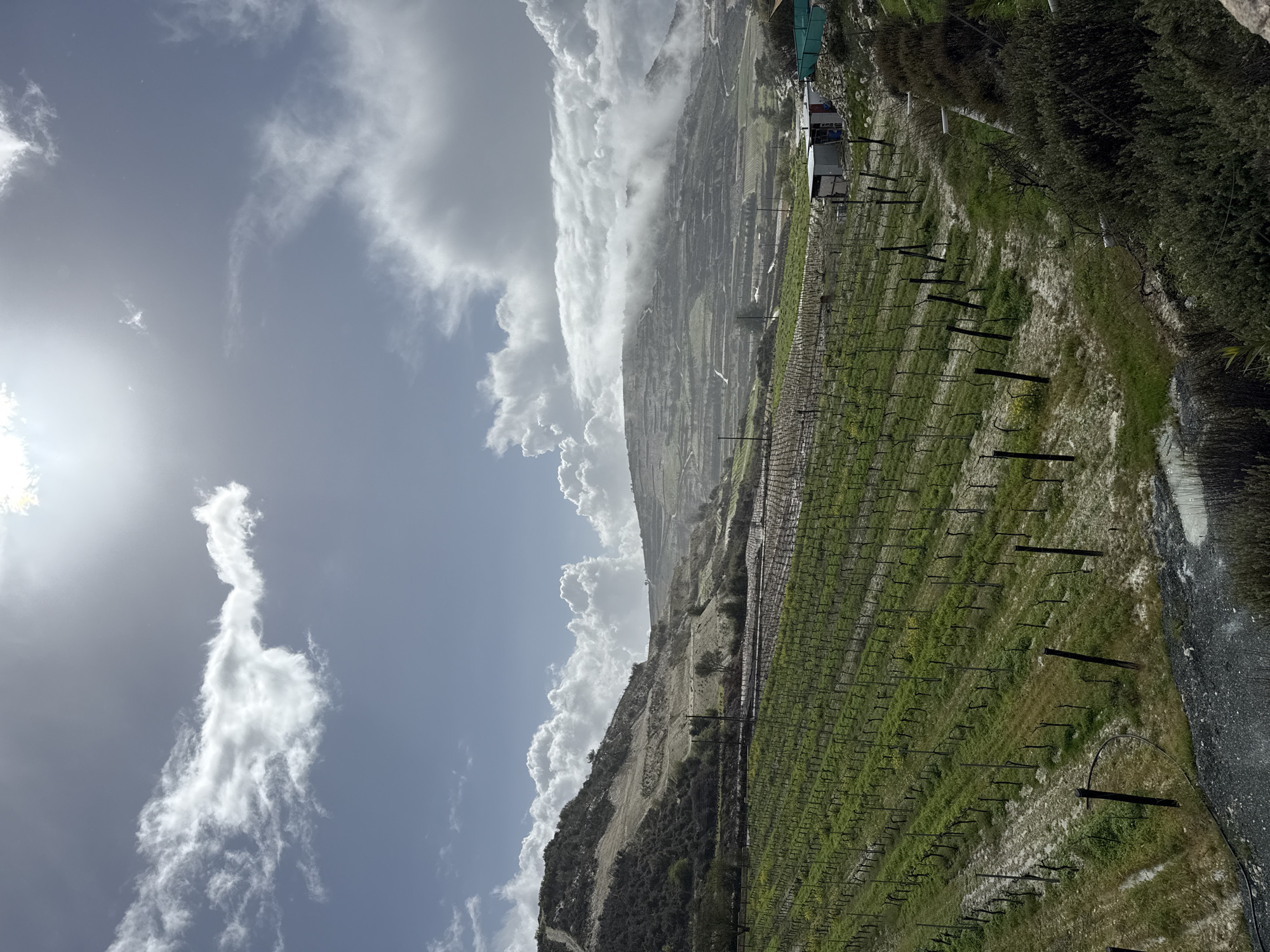 The image depicts a vineyard in Omodos, Cyprus. A terraced hillside is covered in rows of grape vines supported by wooden posts. Buildings are visible at the top of the vineyard. The sky is partly cloudy, with bright sunlight piercing through the clouds. A mountain partially obscured by clouds forms the backdrop. A path runs along the edge of the vineyard.
