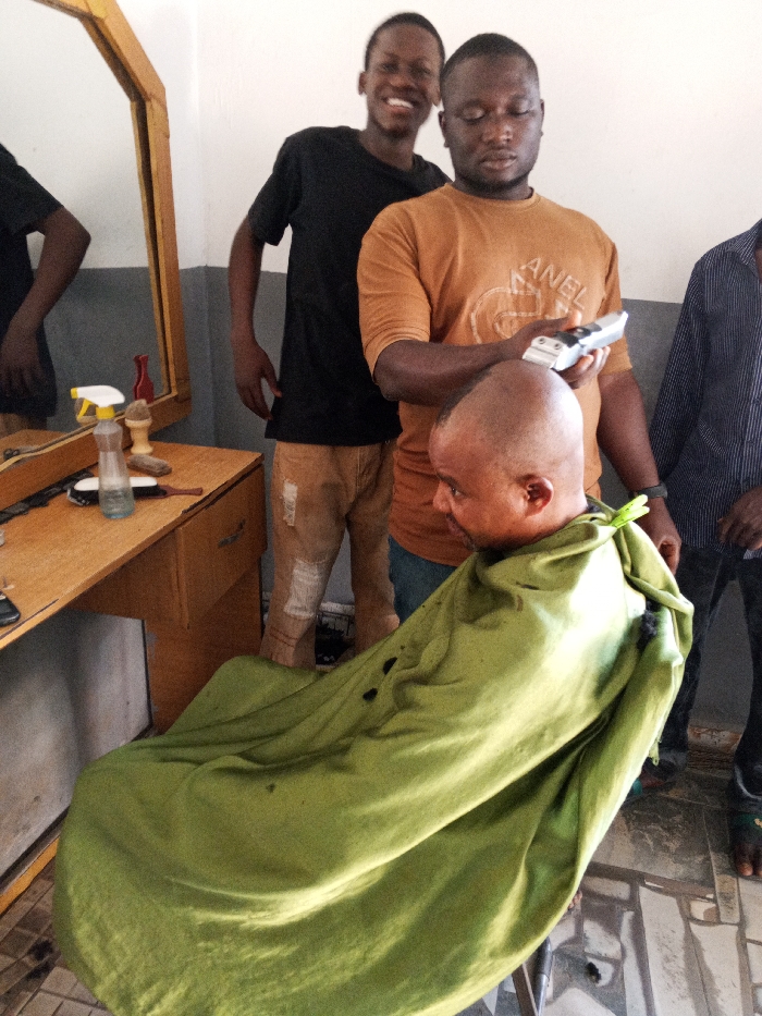 This image depicts an interior scene within a barbershop in Adankolo, Nigeria