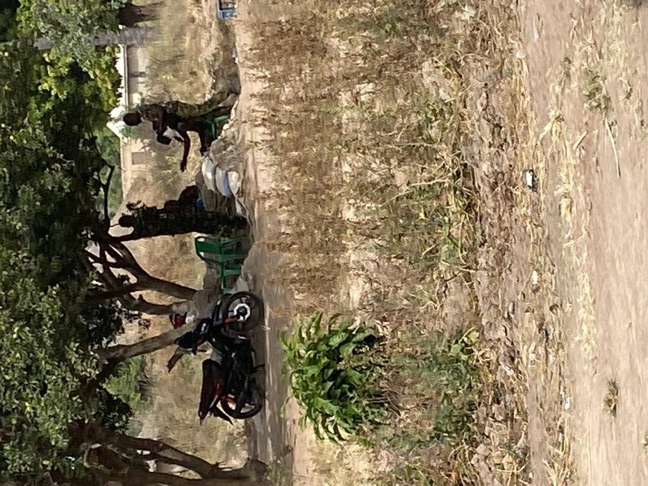 This image depicts an outdoor scene in Zaki Biam, Nigeria, under bright daylight conditions. In the midground, a group of individuals is situated under the canopy of several deciduous trees with green foliage, providing shade. The ground is dry earth with sparse, dry vegetation and scattered debris. On the far left, a black and red motorcycle is parked upright. To the right of the motorcycle, a cluster of at least four individuals is visible. Three individuals are wearing camouflage-patterned uniforms, suggesting military or paramilitary affiliation. One uniformed person stands centrally, facing a seated individual. This seated individual, dressed in dark clothing, extends their right arm towards the standing uniformed person, who has their hands positioned near the seated person's arm, implying an interaction or exchange. Another uniformed person stands slightly to the left, partially obscured by a tree trunk, appearing to look upwards or manipulate something overhead. A fourth person, also in uniform or similar attire, is partially obscured behind the central seated individual. Adjacent to the group, several white and light-colored sacks, possibly sandbags or bags of provisions, are stacked on the ground. Two green plastic monobloc chairs are also present. The foreground is dominated by dry, brown vegetation and patches of bare earth, with a small, healthier green plant bush situated centrally. In the far background, beyond the trees, light-colored structures, possibly buildings, are partially visible.