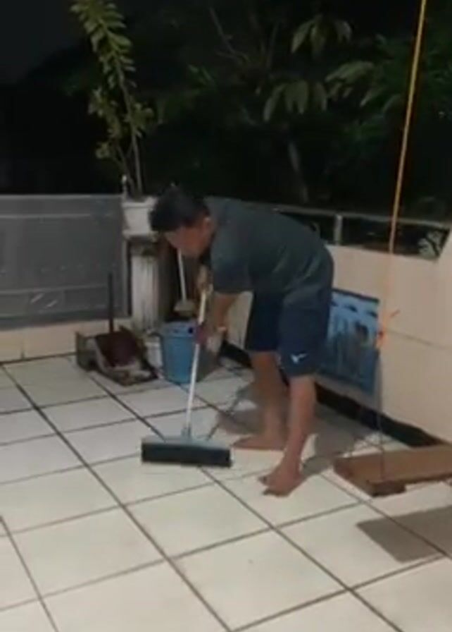 A person is mopping a tiled outdoor patio at night. The individual, a man, is dressed in a gray t-shirt and blue shorts. He is barefoot. The mop has a light blue rubber blade. There is a blue plastic bucket and various gardening tools, including a shovel, visible in the background. Some green plants in pots are visible along a wall, as well as a swing hanging from the ceiling. The patio is lit, but it appears to be dark outside.