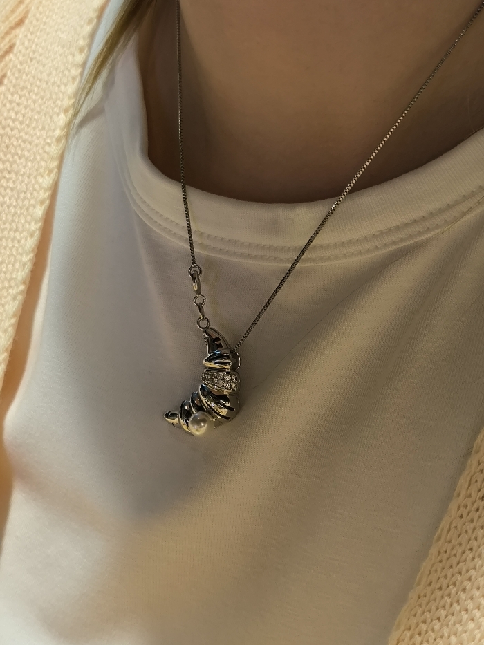 A close-up, chest-level image details a person wearing a necklace. The individual is dressed in a plain white ribbed crew-neck top, overlaid with a light peach or beige knitted cardigan, visible on both sides of the frame. A silver-toned box chain necklace with a prominent pendant hangs around the neck. The pendant is a spiraled, crescent-shaped, silver-toned object, featuring a horizontal line of small, clear, faceted stones embedded across its upper portion. A single spherical white pearl is affixed near the lower, pointed end of the pendant. A small silver-toned lobster clasp and associated rings are visible at the chain's connection point to the pendant on the upper left. The lighting is soft and even. The image does not provide discernible information regarding its specific geographical location, such as the city of Vinnytsia, Ukraine. No active actions or interactions are depicted.