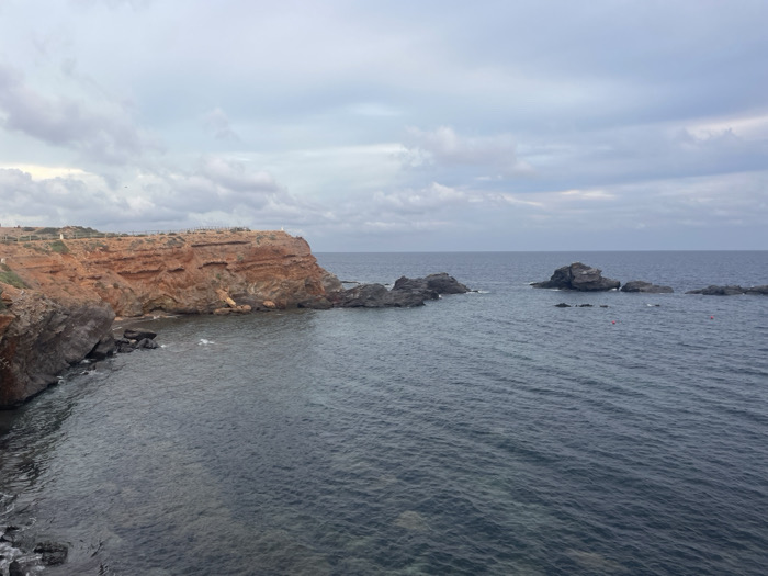 A wide-angle landscape photograph captures the rugged coastline of Cala Cortina in Cartagena, Spain