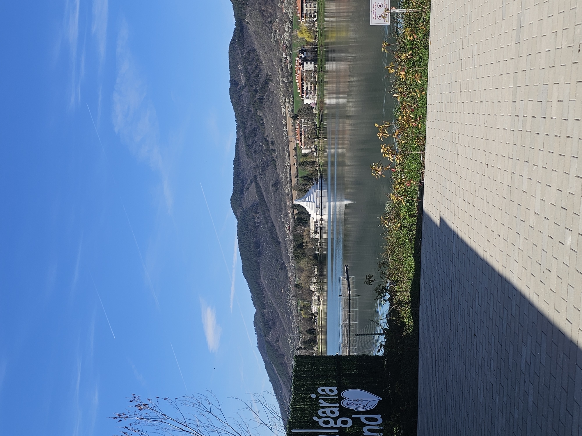 view of Lake Pravets in the city of Pravets, Bulgaria. A mountain range lines the opposite shore. A large fountain is visible in the lake's center. A paved walkway runs along the right side of the frame, and a sign with "Bulgaria land" on it is positioned in the lower portion of the scene. The sky is a clear blue with contrails.