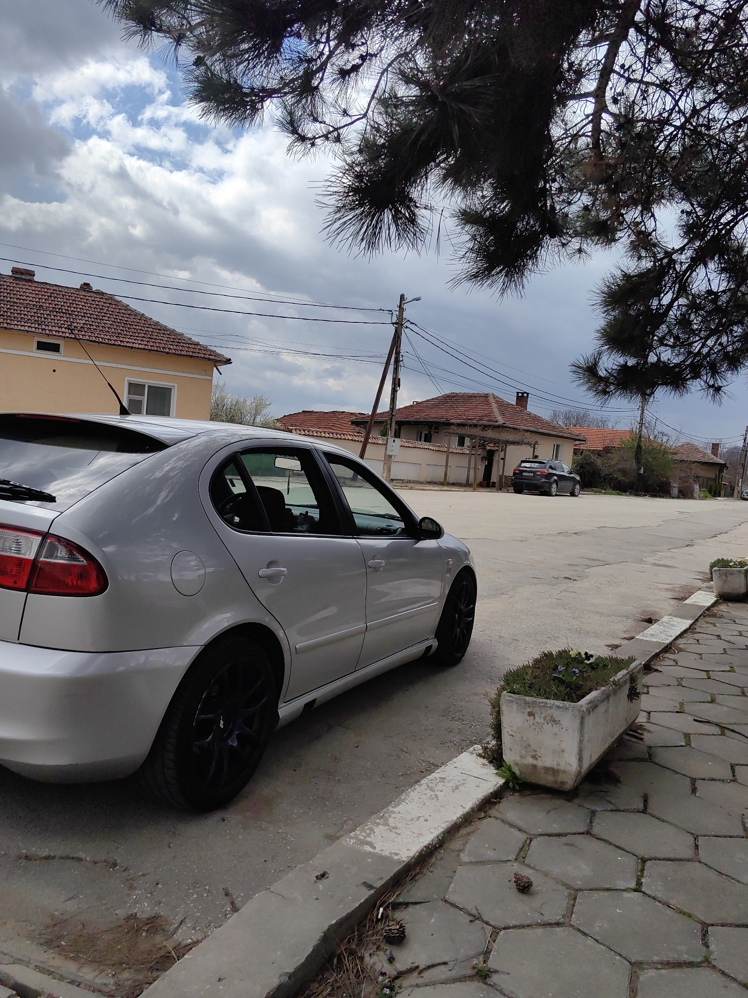 A silver hatchback car is parked on the side of a paved road in Sennik, Bulgaria. The car is a Seat Leon with black wheels. In the background, there are residential buildings with red tile roofs, some partially obscured by tree branches. A dark-colored car is parked in the distance across the street. The sky is cloudy. There are concrete planters along the sidewalk on the right, with some plants growing in them. The sidewalk is paved with gray polygonal stones. A pine tree branch hangs in the upper right corner of the image. Electrical wires run across the scene above the buildings.
