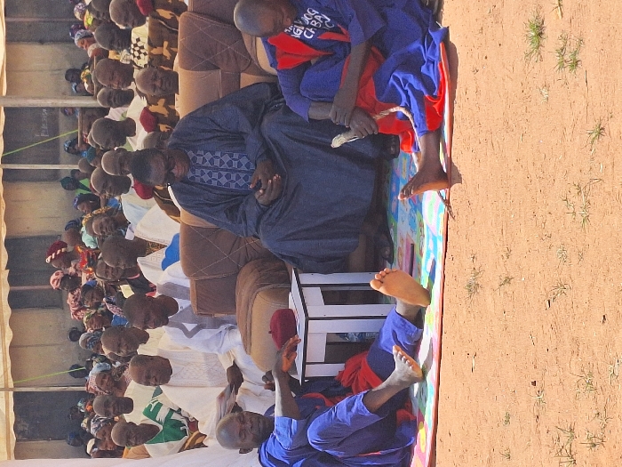 The image depicts an outdoor gathering under a white tent canopy on reddish-brown dirt ground in Unguwan Rimi, Nigeria
