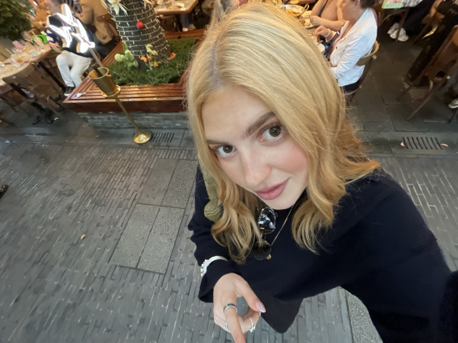A blonde woman takes a selfie outdoors. She wears a dark long-sleeved shirt and multiple rings. Sunglasses hang from her neck. The setting appears to be a restaurant patio. A brick walkway is beneath her, and other diners are seated at tables behind her. A tree in a planter sits nearby, accompanied by a gold-colored champagne bucket holder.