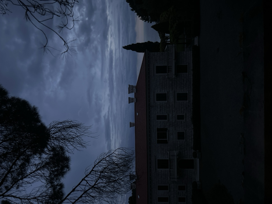 The image displays a two-story, stone-faced building with a red tiled roof, situated in Pržno, Montenegro, under a dark, overcast, blue-grey sky during low light conditions. The building presents multiple dark, rectangular windows and two balconies with visible balustrades on its front facade. The roof is equipped with five distinct, decorative chimneys. In the immediate foreground, a dark, level area, consistent with a lawn, is present. To the right of the building, dark, dense foliage, including a prominent, tall, slender coniferous tree, partially obscures the background. Beyond the building and foliage, a calm, dark body of water, identified as the Adriatic Sea, extends to the horizon. Silhouetted, bare tree branches are visible in the upper left and upper right portions of the frame. No individuals, specific actions, or interactions are discernible.