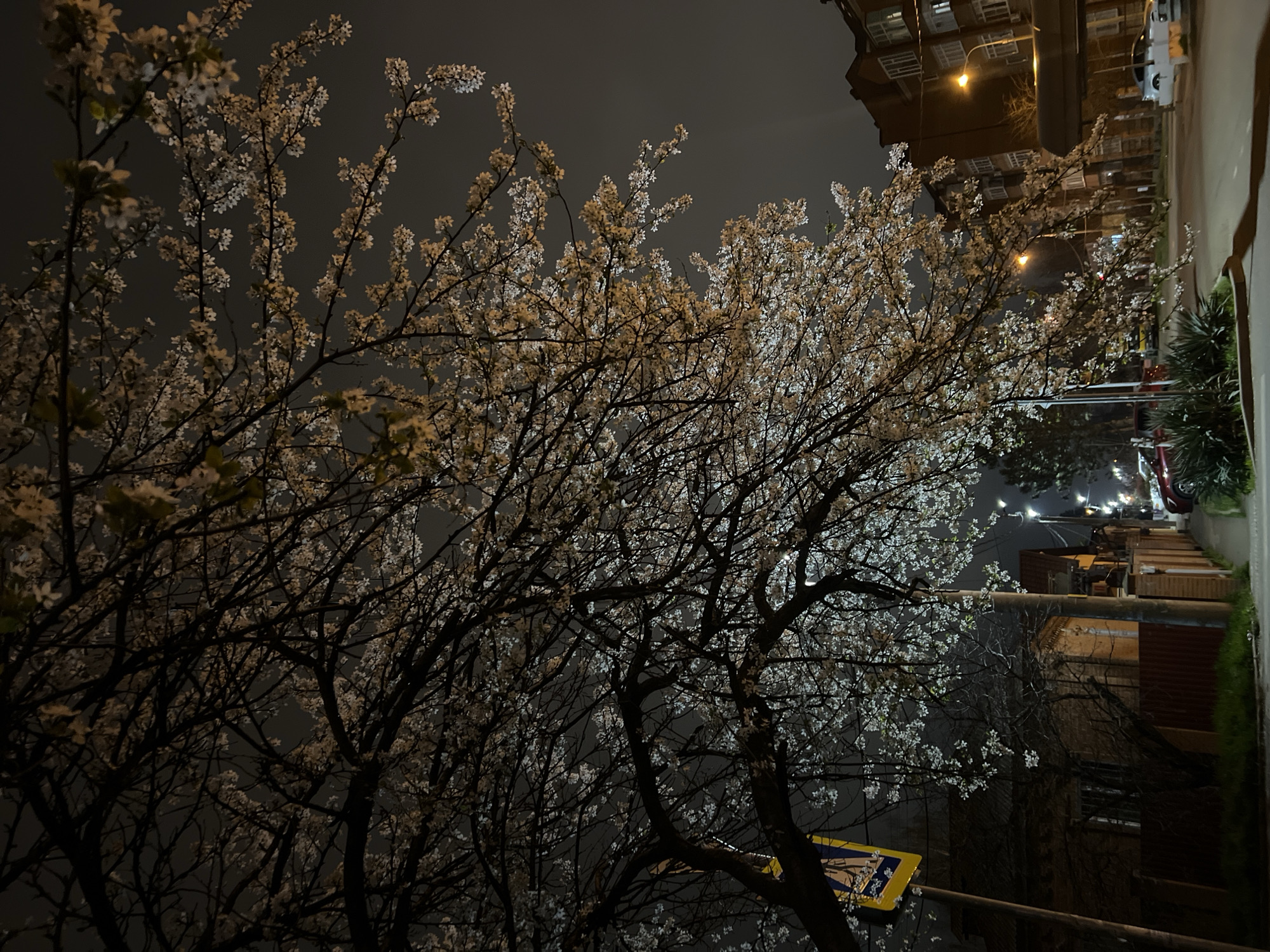 A street scene at night in Krasnodar, Russia. The image is rotated approximately 90 degrees counterclockwise. Trees with white blossoms are in the foreground, illuminated by streetlights. A building with illuminated windows is visible in the background. A street sign with a yellow and blue emblem is present. A sidewalk and street are seen on the right side of the image. A parked vehicle is faintly visible in the distance. A brick structure with a fenced area along the right side of the image is visible.