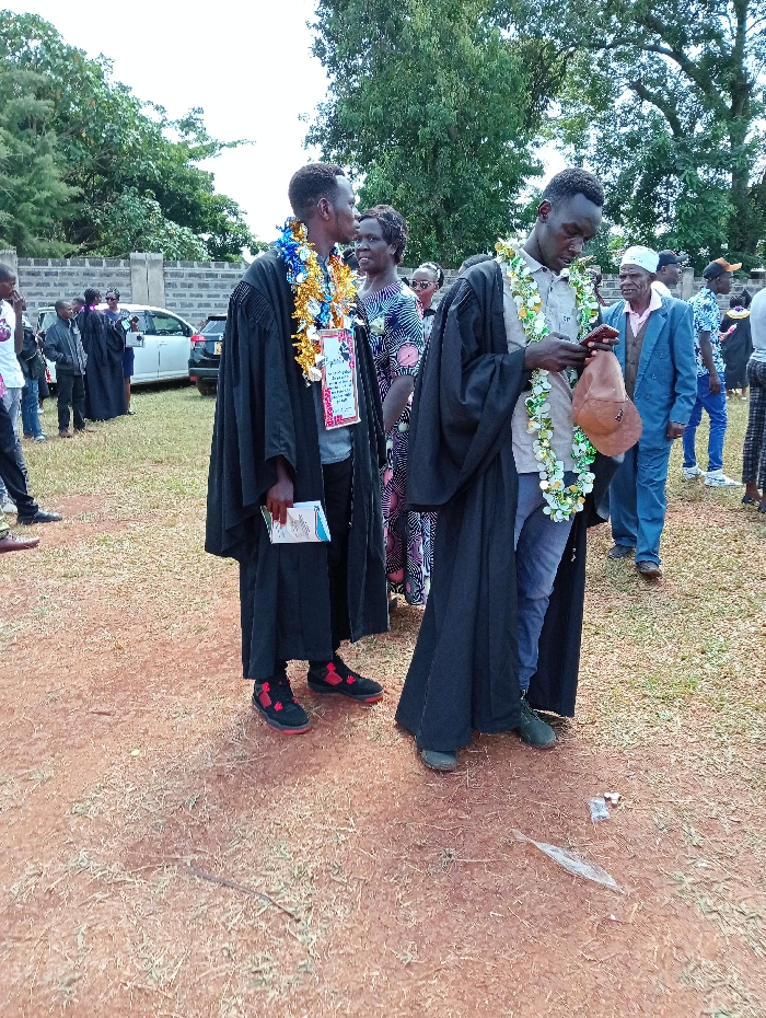 Two people in graduation gowns adorned with tinsel leis stand on dry grass. One man holds a book and wears red and black sneakers, while the other looks at his phone and carries a tan hat. Behind them, other people stand or walk, including a woman in a patterned dress and a man in a light blue suit and white cap. Vehicles are parked in the background, and trees are visible above.