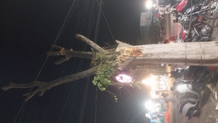 A nighttime street scene in Gampongpaya, Indonesia, features a prominent, partially stripped tree trunk in the foreground with exposed lighter wood and multiple pruned branches extending upwards