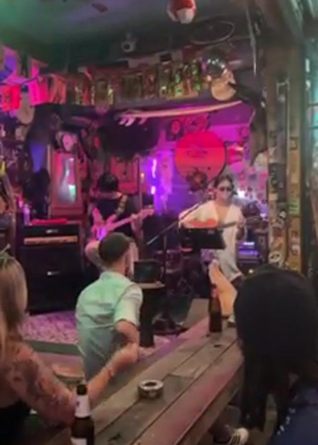 A band is performing in a crowded, heavily decorated bar. The lead singer, wearing sunglasses and a white shirt, plays an acoustic guitar and sings. A guitarist sits behind him to his left, and a drummer is visible in the background. The bar is brightly lit with pink and green lights, and the walls and ceiling are covered in various decorations and items. Several patrons are seated at a long wooden table in front of the band, listening and enjoying drinks. One woman with a tattoo on her arm smokes a cigarette.