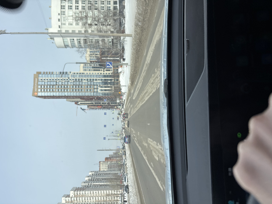The image captures a daytime winter street scene in Yekaterinburg, Russia, viewed from inside a vehicle