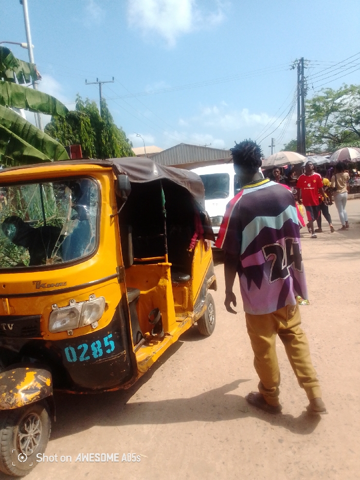 An outdoor daytime scene in Egbagu, Nigeria, depicts a yellow Keke (tricycle taxi) parked on a reddish-brown dirt road
