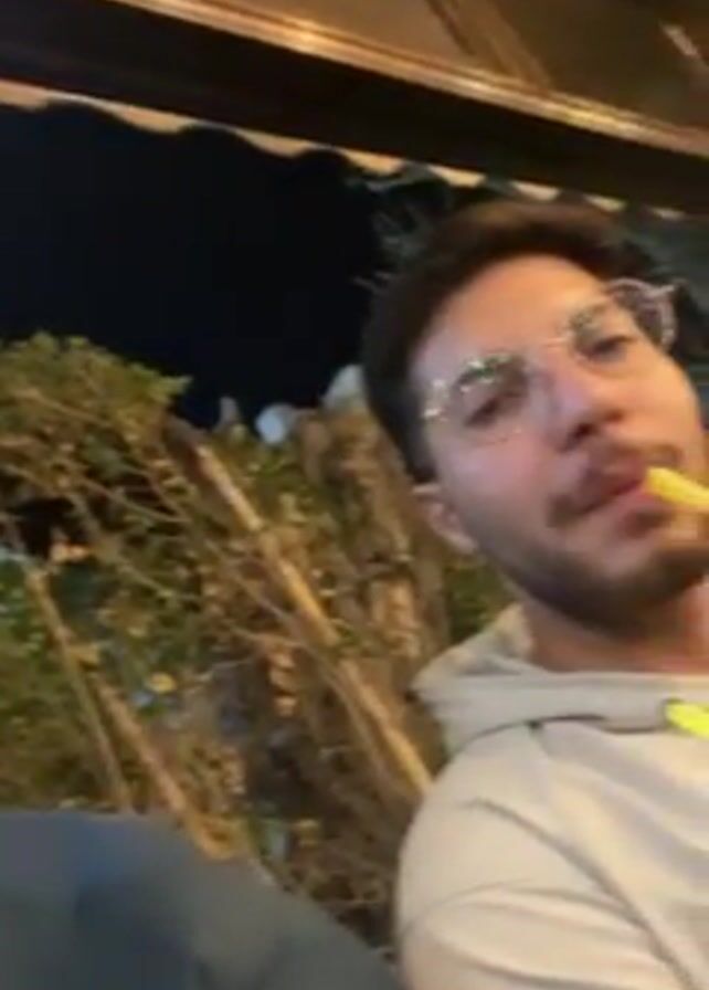 A man is sitting outside at night, smoking a hookah. He is wearing a light gray hoodie with neon yellow drawstrings and clear-framed glasses. There is a dark blue object in the foreground, partially obscuring the view. Behind the man is greenery, and above him is a partial view of a striped awning.