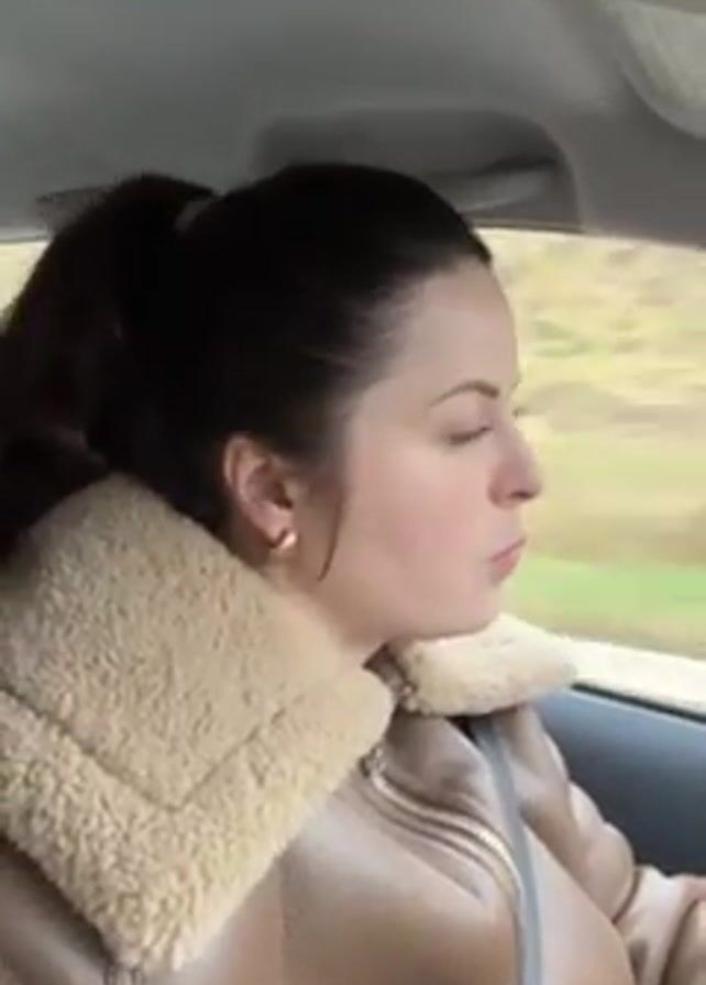 woman riding in a car, presumably as a passenger. She has dark hair pulled back in a ponytail, fair skin, and is wearing a brown leather jacket with a cream-colored fuzzy collar, and gold earrings. The car appears to be moving, with blurred trees visible through the window. The interior of the car is visible, including the ceiling and the window frame. The woman looks directly at the camera briefly, then looks back out the window. The overall tone of the video is casual.