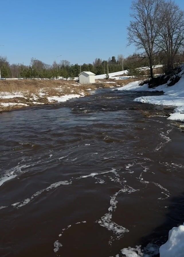 river flowing rapidly under a clear blue sky. Patches of snow line the banks, suggesting it's early spring. The water is murky brown, and there's a significant amount of white foam visible on the surface. Trees, bare of leaves, are visible along the banks. On one side, there's a small white structure in the distance. The camera pans slightly to the right, revealing a road or path sloping down to the riverbank. The opposite bank shows a small island or patch of land in the middle of the river.