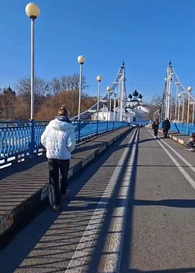 A young woman wearing a white puffer jacket and dark pants walks across a bridge in daylight and sits down on the curb next to the railing. She sits on the curb with her legs extended on the paved walkway. The bridge is wide, allowing pedestrian traffic on either side of a center lane. The bridge has blue decorative railings and tall light posts. In the distance, a white building with black domed roofs is visible. The sky is clear and blue. Other people are walking on the bridge in the distance.
