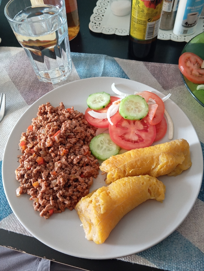 The image displays a meal served on a white circular plate, resting on a striped placemat, situated within an indoor setting in Ripollet, Spain. The plate contains a portion of seasoned ground meat mixed with diced red and white vegetables on the left, a salad of sliced red tomatoes, white onions, and green cucumbers on the top right, and two cooked, elongated yellow plantains on the bottom right. A clear glass of water is positioned to the upper left of the plate on the placemat, with the tines of a silver fork visible on the far left edge. The background features a dark table surface holding a white doily, a white shaker, a dark glass bottle identified as "Aceite de Oliva Virgen Extra" (Extra Virgin Olive Oil), another shaker, and a white container labeled "EDULCORANTE" (Sweetener). A partial view of a green bowl containing additional sliced tomatoes is visible on the far right.