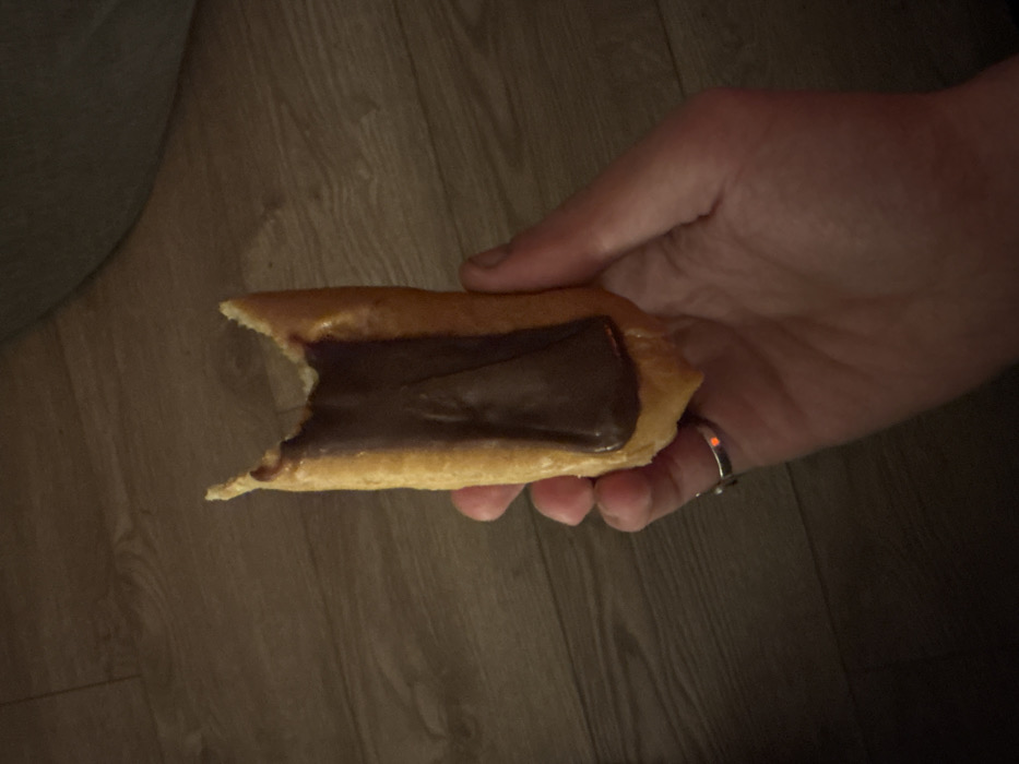 A single human hand holds an elongated, golden-brown pastry filled with dark chocolate. The pastry, resembling a long john donut or éclair, has a semicircular bite taken from its top-center, exposing the creamy, dark brown chocolate filling. The hand, likely a right hand, shows the thumb, index, and middle fingers supporting the pastry from beneath. A silver-colored ring is present on the ring finger, exhibiting a small red reflection or highlight. The background consists of a light brown wooden floor with visible grain patterns, while an out-of-focus dark fabric or object occupies the upper right portion of the frame. The scene is illuminated by dim, ambient indoor lighting. No visual cues within the image identify a specific location within Manchester, United Kingdom.