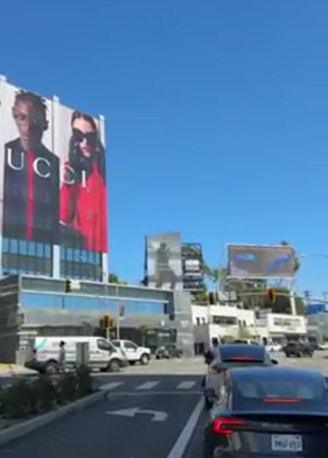 n urban street scene on a bright, sunny day. The camera focuses on a major intersection with various buildings and billboards. A tall building displays a large Gucci advertisement. Closer to the camera is a digital billboard showcasing a person dancing with the words "the dance floor on bear night" displayed alongside the HBO Max logo and hashtag GIFboard. Traffic includes cars, a white van, and pedestrians using the crosswalk. The sky is a clear blue.