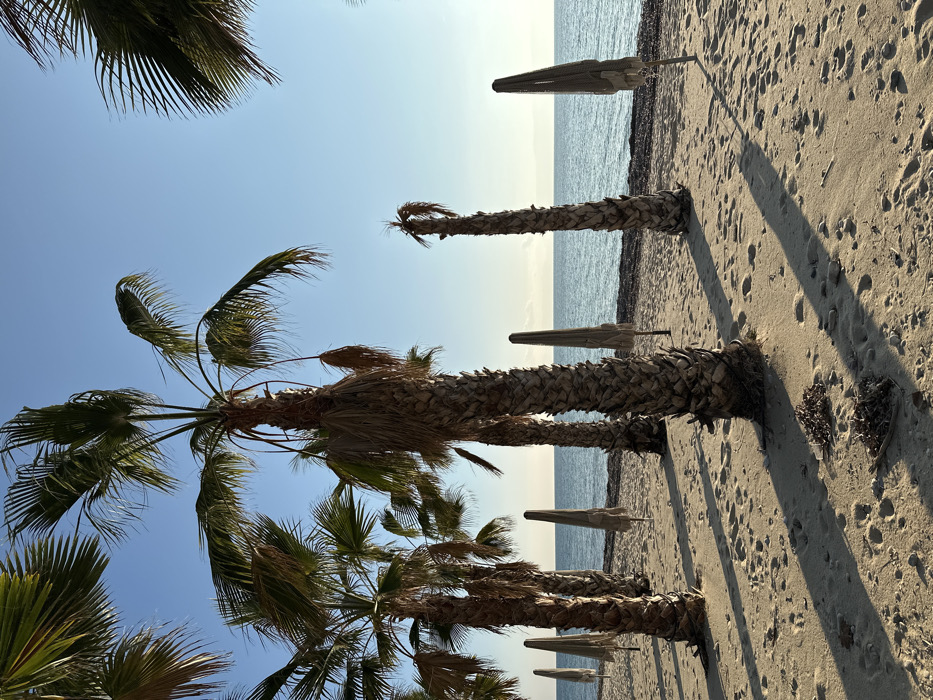 The image depicts a tranquil coastal scene at Ofrynio Beach, Greece, viewed from the sand looking towards the sea. In the foreground and midground, numerous established palm trees with rough, textured trunks are scattered across the sandy beach. Many fronds are green and fanned out at the top, while others appear dry and brown, hanging vertically down the trunks. Long shadows are cast from the palm trees across the light brown sand, indicating a low sun angle. No people are present. Several collapsed beach umbrellas, made of light-colored fabric and folded tightly, stand upright at intervals along the sandy expanse, positioned between the palm trees and the water's edge. At the immediate waterline, a dark line of what appears to be seaweed or natural debris is visible on the sand. The calm, clear blue sea extends horizontally across the background, meeting a hazy, light blue sky at the horizon. The overall lighting suggests either early morning or late afternoon.