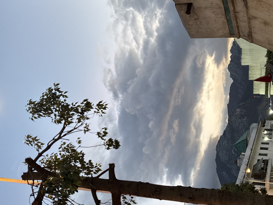 A partly cloudy sky hangs over a mountain range, partially obscured by buildings