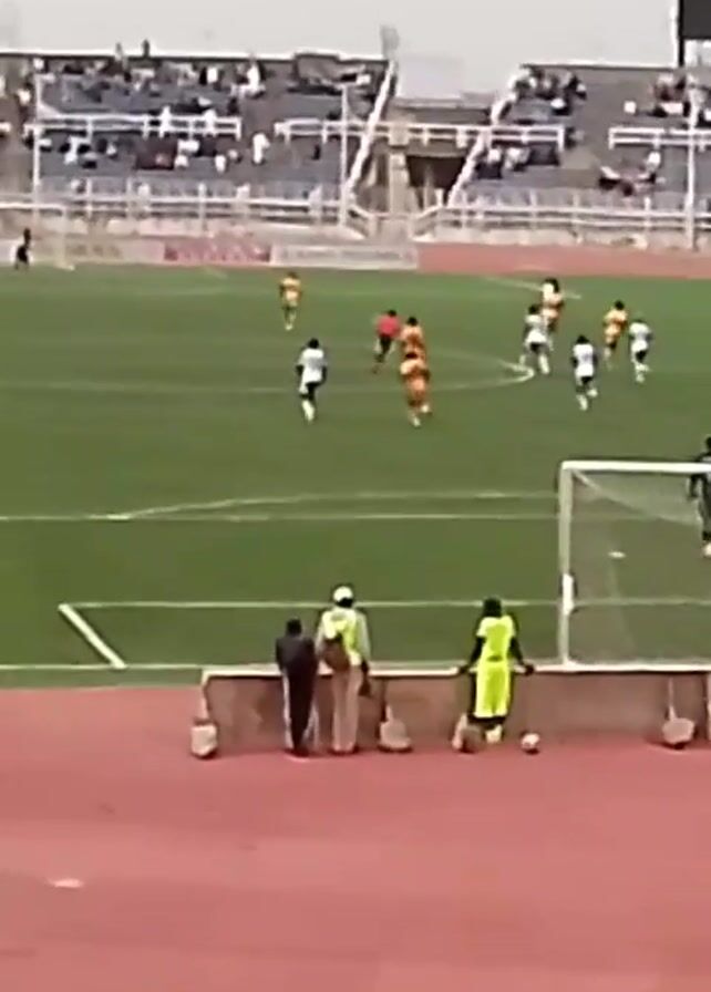 The video depicts a soccer match in progress at a stadium. Players in orange and white uniforms are actively moving on a green field. A soccer goal net is visible on the right side of the frame. Several individuals are positioned near the side of the field, some wearing reflective safety vests. The stands are partially filled with spectators. The sky overhead appears overcast.