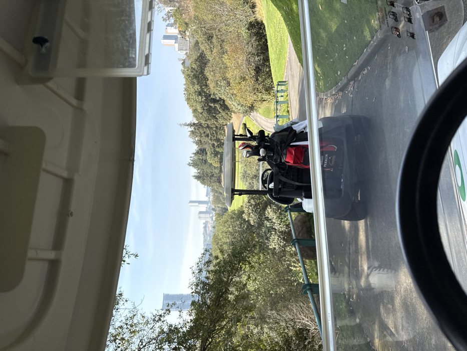 A golf cart ride shows a course with green grass and trees under a bright sky. Buildings can be seen in the distance. Another golf cart sits ahead on the paved path, its clubs visible. Part of the roof and steering wheel of the golf cart the photo is taken from are in the frame.