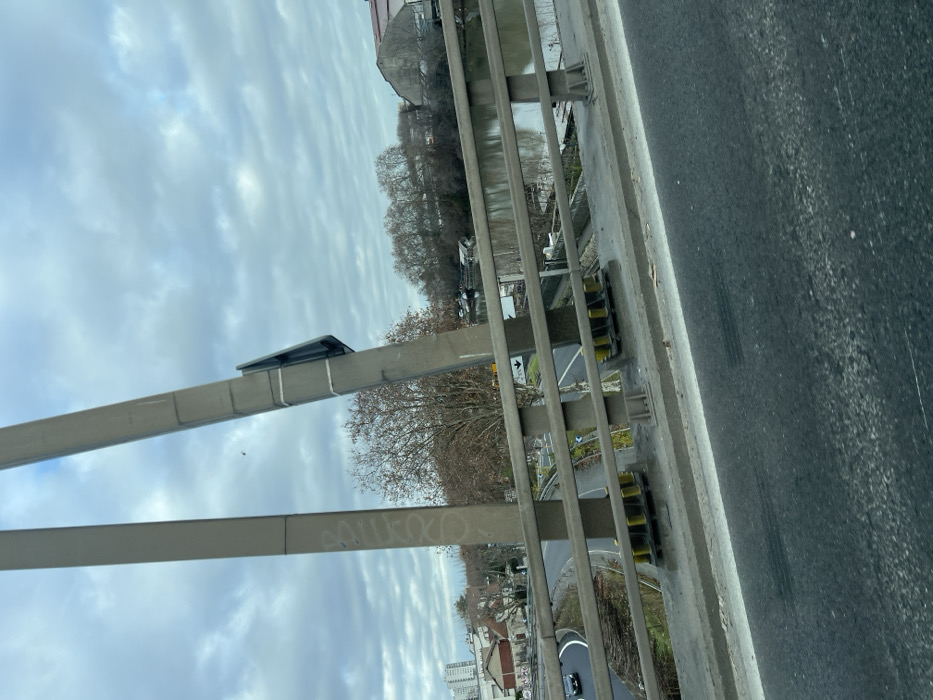 The image presents an elevated view from a bridge in L'Île-Saint-Denis, France, looking eastward over infrastructure, a waterway, and urban landscape under an overcast sky. In the immediate foreground, the dark asphalt surface of the bridge is visible, marked by tire traces and light debris. A concrete curb and grey metal guardrails, comprising horizontal bars supported by vertical posts, define the bridge's edge. Two prominent, angled grey structural columns, likely supporting the bridge's main span or cables, rise through the frame; the left column exhibits faint graffiti, and the right column features a black rectangular device mounted to its side. Below the bridge, a curved asphalt road with white lane markings is observed, descending and turning left. A single dark-colored sedan is visible on this road. Beyond the road and vegetation, a body of water, presumably the Seine River, flows with murky, greenish-brown water. Several vessels, appearing as barges or houseboats, are moored along the opposite bank, partially obscured by a line of bare deciduous trees and sparse vegetation. Further in the background, to the left, a cluster of multi-story residential buildings with light-colored facades and reddish roofs, alongside a taller apartment block, populate the distant cityscape. To the right of the river, a large industrial-style building with a distinctive gabled grey roof is present. The entire sky is covered by an extensive layer of grey stratocumulus clouds. No individuals are visible.