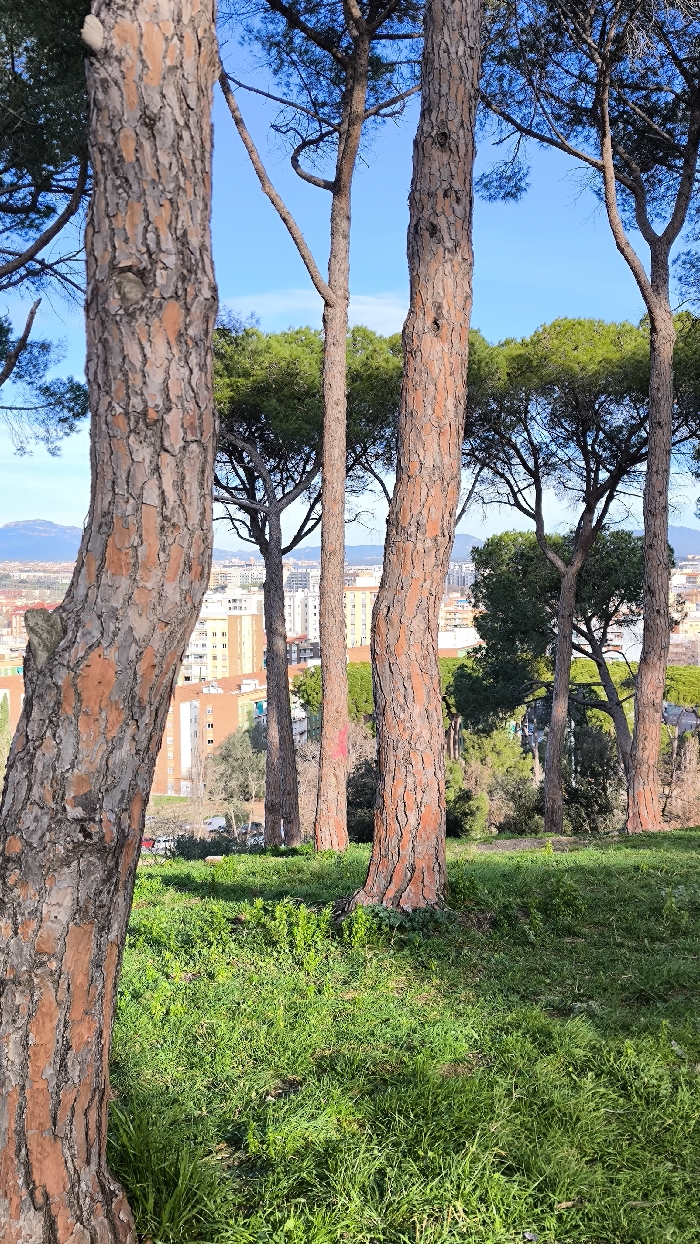The image displays an outdoor scene located in Cerdanyola del Vallès, Spain, captured from an elevated position overlooking the city. The foreground consists of natural green grass and sparse vegetation, illuminated by sunlight which casts shadows. Several tall, slender pine trees with reddish-brown, textured bark dominate the midground. Seven primary tree trunks are visible, with the leftmost one partially cropped. One tree trunk in the mid-right distance exhibits a faint pink mark on its lower section. Beyond the trees, the background reveals a dense urban area comprised of numerous multi-story buildings, varying in color from white and beige to orange and light blue. In the far distance, a range of mountains or hills is visible beneath a clear blue sky with minimal cloud cover. No individuals or animals are present, and no actions or interactions are depicted within the static landscape.