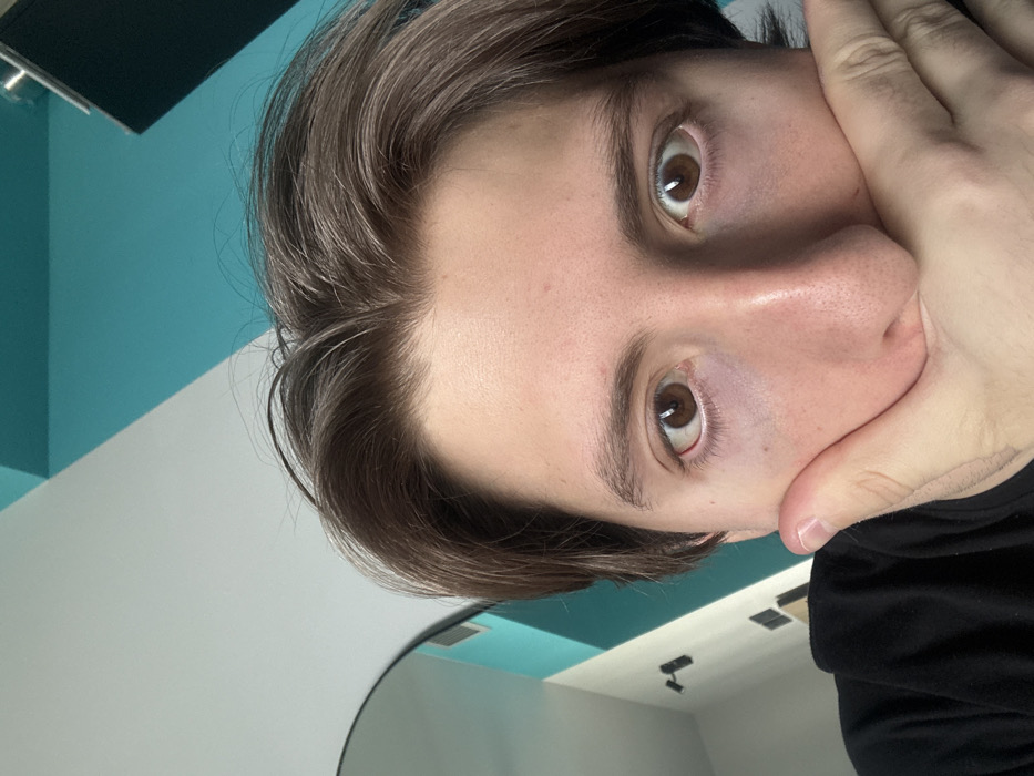 - "A close-up, frontal shot of a light-skinned individual with brown hair and wide-open brown eyes, covering the lower part of their face, including the mouth, with their right hand" by FM-xmS903, licensed under CC BY 4.0