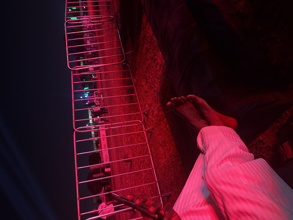 A red-lit, angled view shows a person lounging with bare feet and white striped pants. They hold a phone, seemingly watching an event obscured by a barricade on a grassy field. Lights and people are visible in the distance beyond the barricade. The environment appears dark.