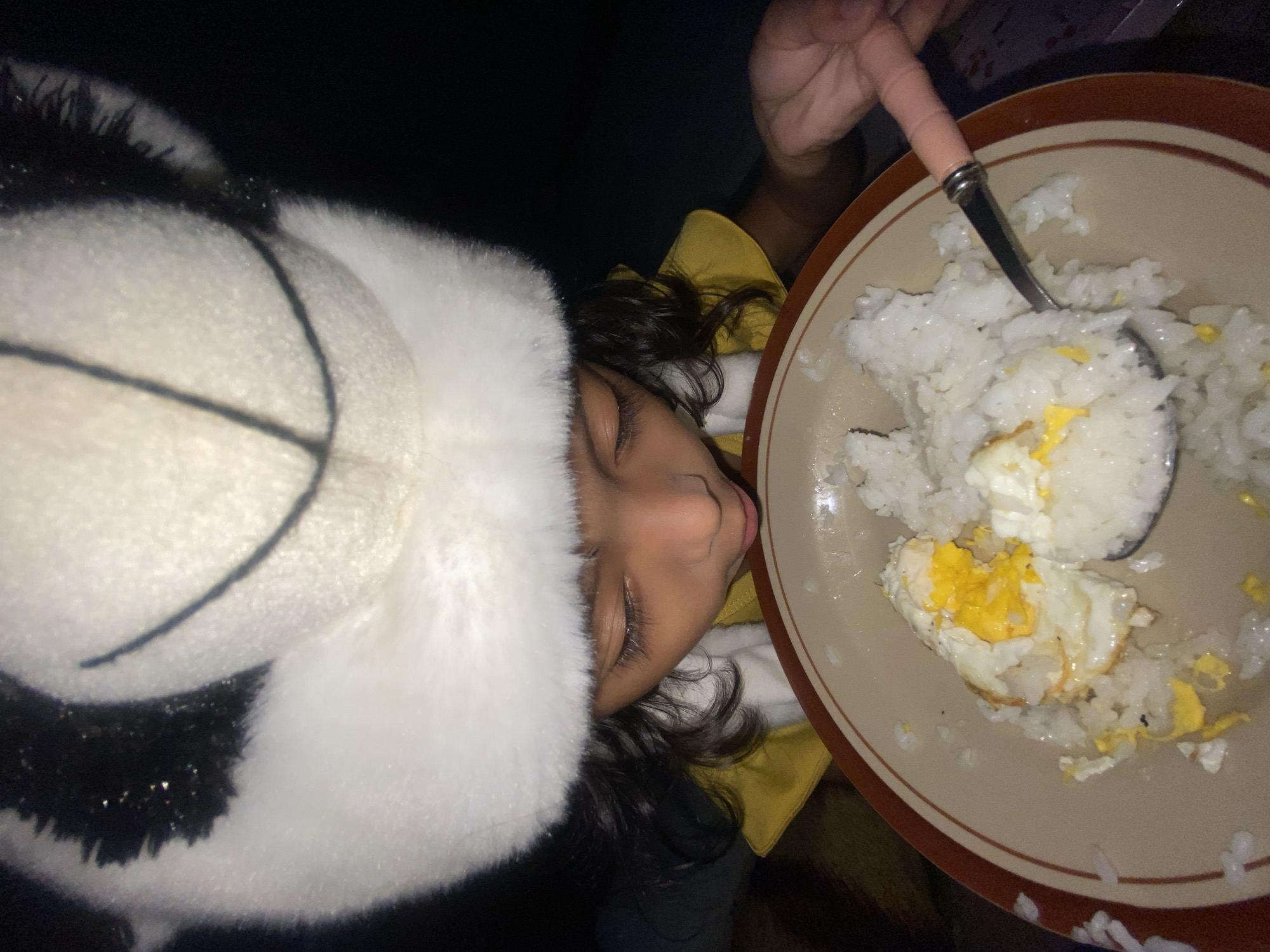 An overhead shot depicts a young individual, likely a child, focused on a plate of food in a dark environment within the city of Gelam, Indonesia. The child wears a white, fuzzy hat with black details resembling a panda, and a yellow top is visible beneath the hat. Their gaze is directed downwards towards a beige plate with a brown rim. The plate contains white cooked rice and at least two fried eggs, one partially broken with a visible bright yellow yolk. A silver spoon with a light pink handle is seen in the child's hand, actively scooping rice and egg from the plate. The background is largely dark and out of focus.