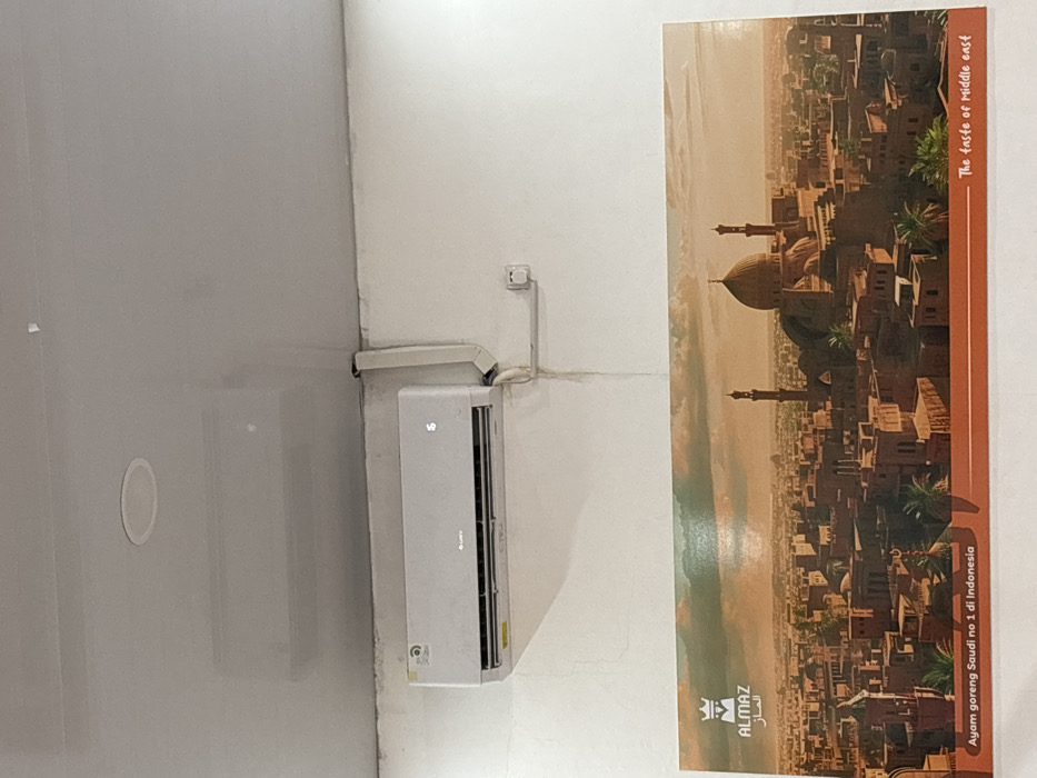 n interior wall with a white air conditioner unit mounted on it. The wall is white with a light gray ceiling. There is a poster on the right side of the wall with an image of a city skyline. The poster is in Indonesian and English. It says "The taste of middle east" and "Ajang goreng Saudi no 1 di Indonesia". There is also a logo with "ALMAZ" written on it. The location is Bekasi Regency, Indonesia (latitude: -6.31, longitude: 107.166).