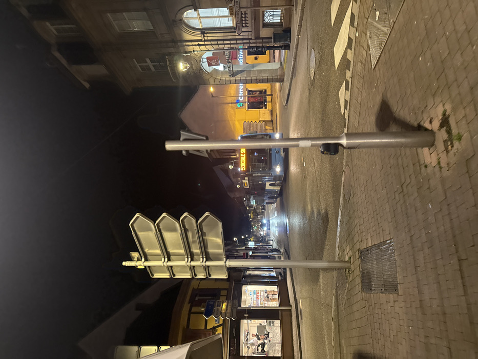 A nighttime street scene in a European town. Streetlights illuminate the road where a bus is visible. Signs point in various directions. Buildings line the street, and a "Carrefour" sign is visible. The scene is slightly blurry. A traffic signal is in the foreground, and the pavement is made of cobblestones. A metal access panel is set into the pavement.