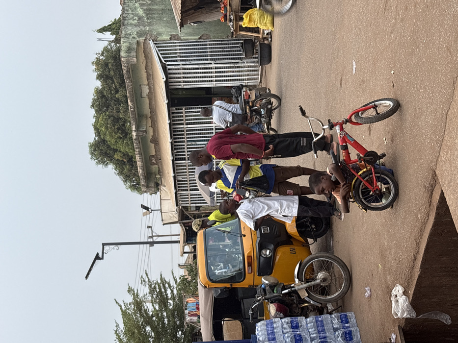 In an outdoor scene, several people are standing near a yellow motorized tricycle (tuk-tuk) on a street. Some of the people are looking at a red bicycle. There is a row of bottled water and a motorcycle parked nearby. Behind the tricycle, there is a lamp post, and a building is partially visible. A green tree and a building with a grated fence are in the background.