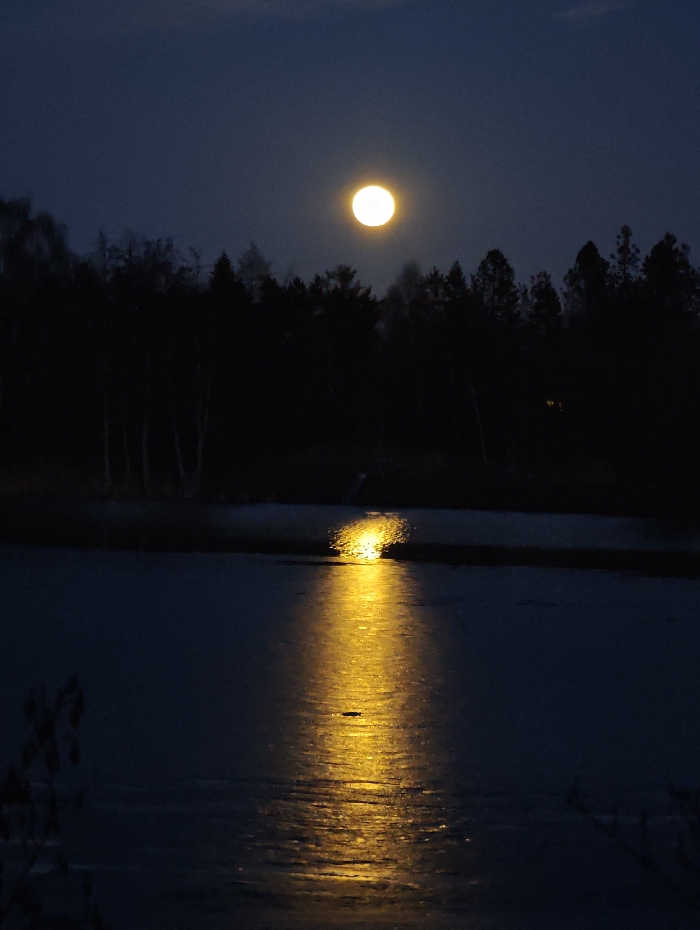 This image depicts a nocturnal outdoor scene over a body of water in Tarup, Denmark. A prominent, bright, full moon is centrally positioned against a dark blue-black sky. Immediately below the moon, a dense, dark silhouette of a tree line spans the horizon. The moon's intense yellow-orange light casts a distinct, elongated reflection that extends across the dark surface of the water, which appears partially frozen or extremely still. A small, dark, unidentifiable oblong object rests within this bright lunar reflection on the water's surface, slightly below the image's vertical center. Faint, out-of-focus dark vegetation, possibly bare branches or reeds, is visible along the extreme left edge of the foreground. No human figures or activities are present.