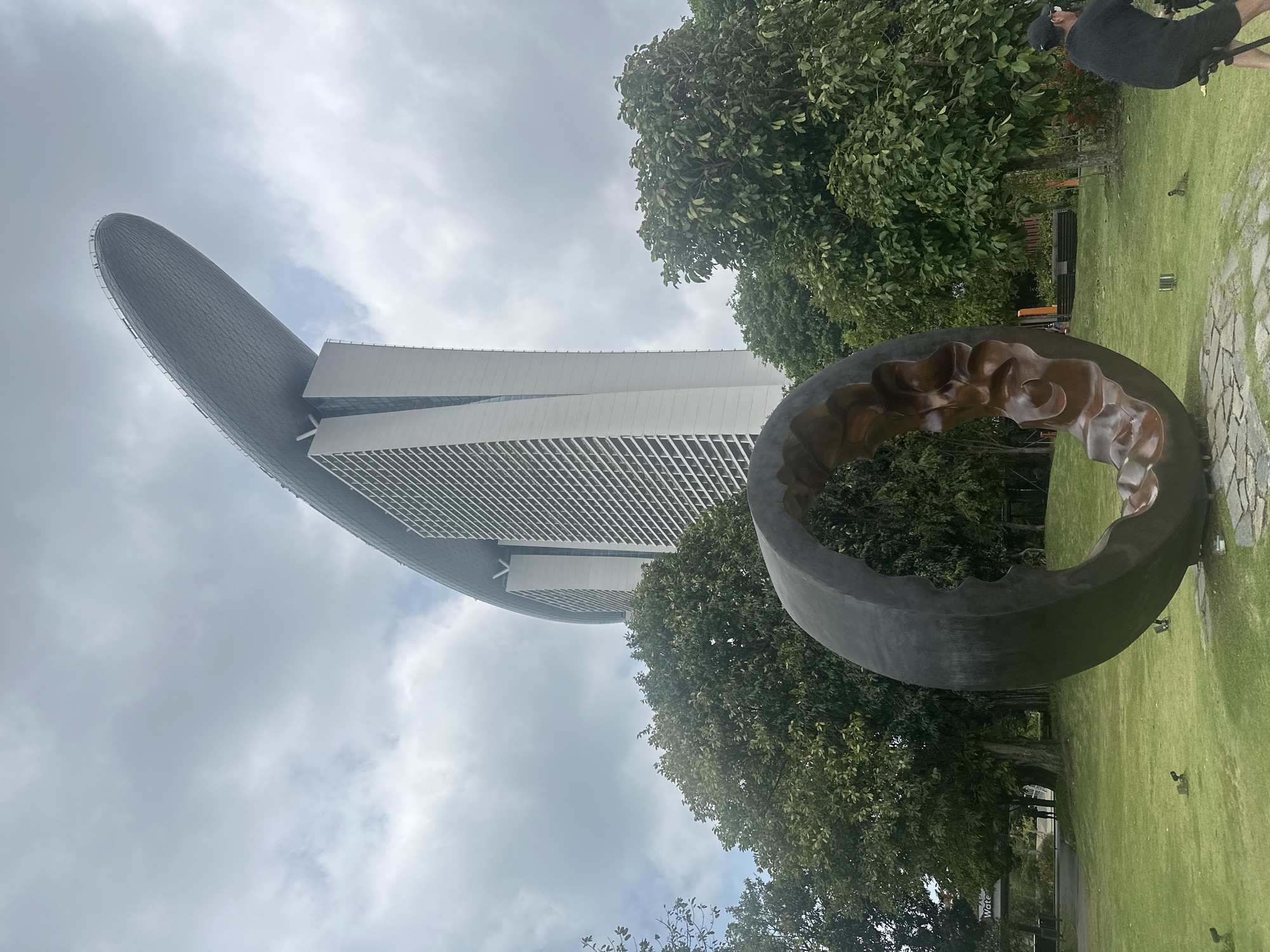 The image displays a daytime scene in the Marina Bay area of Singapore, Singapore, under a predominantly cloudy sky. In the foreground, a large, dark, circular sculpture, identified as "Planet" by Marc Quinn, rests on a stone base on a manicured green lawn. The sculpture features a rough, reddish-brown, textured interior, contrasting with its smooth, dark exterior. To the immediate right of the sculpture, a person, seen from the back, is partially visible wearing dark clothing and a black baseball cap, appearing to be seated on a bicycle or similar apparatus. The midground consists of numerous green trees, some densely foliated, forming a line behind the sculpture and extending towards the left. In the background, prominently featured, is the iconic Marina Bay Sands complex, a large white skyscraper with a distinctive, elongated, boat-like structure perched atop its three towers. A path and distant figures are faintly visible through the trees on the left side of the image, beyond the sculpture.