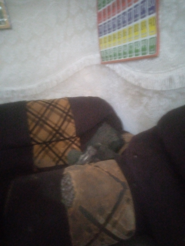The image displays an indoor scene within a residence located in Ngong ward, Kenya. The primary subject is a dark-colored sofa set, possibly maroon or dark brown, occupying the lower and central portions of the frame. One visible sofa cushion features a distinct yellowish-brown tartan pattern with intersecting dark lines. A light brown or tan upholstered section, possibly an armrest, is present in the lower right. An irregularly shaped, dark grey object, potentially a pillow or draped fabric, rests between two sections of the sofa. The background consists of a light-colored wall with a subtle textured pattern. Affixed to the upper right section of the wall is a rectangular chart or poster, divided into multiple horizontal rows of distinct colored blocks (e.g., red, blue, yellow, green), containing numbers or text, with "10," "20," "30," and "40" partially legible at the top. A portion of a framed object is visible on the upper left wall. No individuals are present in the scene.