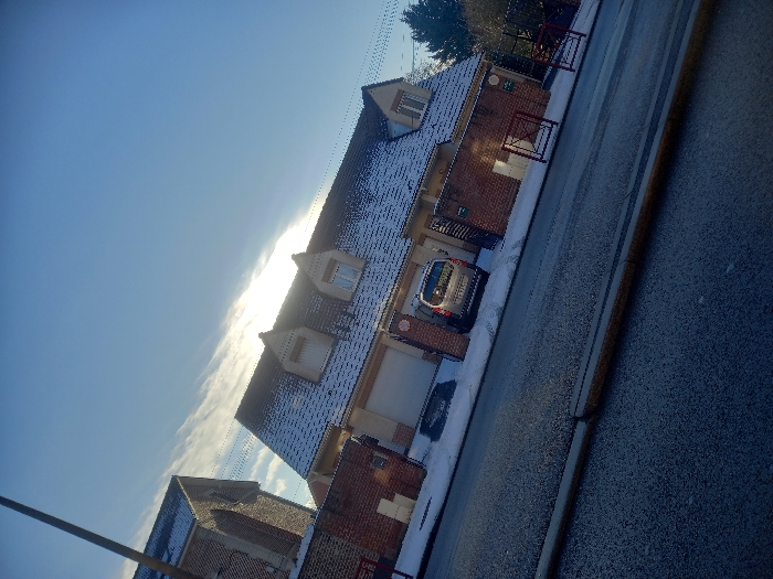 An oblique, daytime exterior photograph depicts a snow-covered residential scene in Sallaumines, France. The foreground features a dark asphalt road with sparse white particulate accumulation, consistent with frost or light snow. A yellow-painted curb runs parallel to the road. In the midground, a silver minivan, potentially a Peugeot Partner, is parked on a snow-covered driveway. Its rear is visible, displaying a French license plate and a yellow decal with the word "VIVRE" on its rear window. The property is delineated by a low brick wall and a black metal gate. Two red-painted metal safety barriers are positioned on the snow-covered sidewalk. The background primarily features a two-story house with a dark, snow-covered gabled roof. Three dormer windows are prominent on the roof. The house facade is light-colored, and a garage door is visible at ground level. To the immediate left of this house, a portion of a brick building with an arched recess and a snow-covered roof is discernible. A dark utility pole extends vertically along the far left edge of the frame. The upper portion of the image shows a clear blue sky with a bright sun partially obscured by white clouds, creating a lens flare effect. Overhead utility wires traverse the sky. A dark green tree is visible on the far right behind the main house. No individuals are present in the scene.