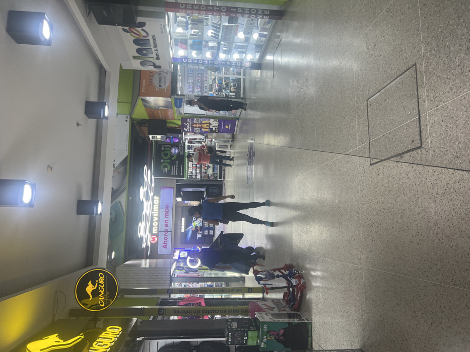 The image captures a bright interior scene of a shopping mall, with various stores visible. Storefronts with prominent logos like "Kangaroo," "movilmar," and "Planet" are displayed. Shoppers are seen walking through the mall. Several advertisements and product displays line the walkway. The flooring appears to be a speckled pattern, and rectangular access panels are visible. Lighting fixtures are installed on the ceiling.