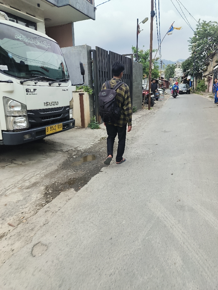 An image captured in Cimenyan, Indonesia, depicts a male individual walking away from the camera on a paved street under an overcast sky